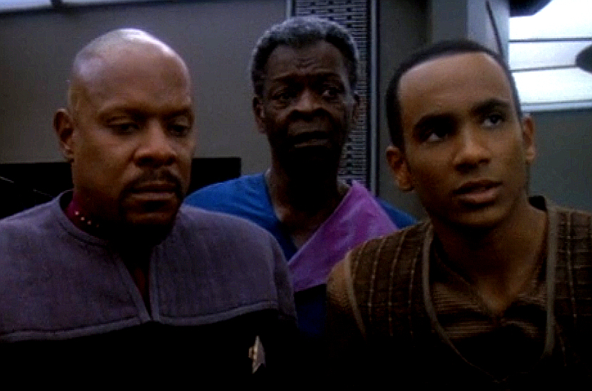 Drei Generationen vereint: Captain Benjamin Sisko (Avery Brooks, links), Joseph Sisko (Brock Peters, Mitte) und Jake Sisko (Cirroc Lofton, rechts) in “Far Beyond the Stars” (Szenenfoto: CBS).
