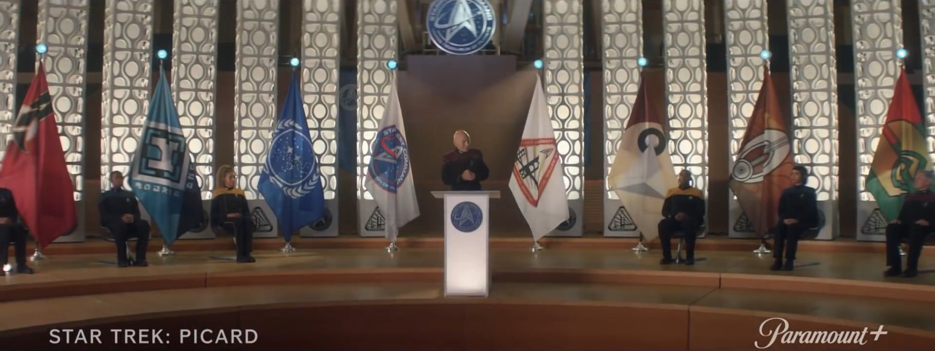 Delegationen aus der Milchstraße lauschen Admiral Picard