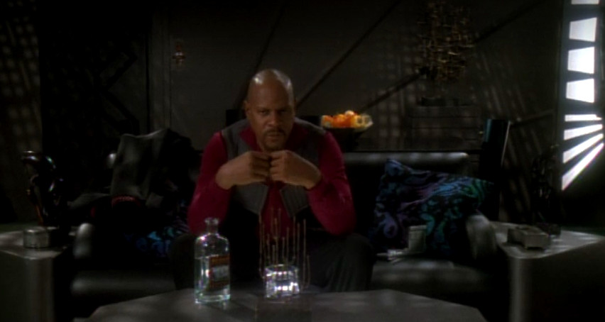 Captain Sisko (Avery Brooks) wirft während des Dominion-Krieges einige seiner moralischen Grundsätze über Bord, um die drohende Kriegsniederlage abzuwenden (Szenenfoto: 6×19 “In the Pale Moonlight”, CBS).